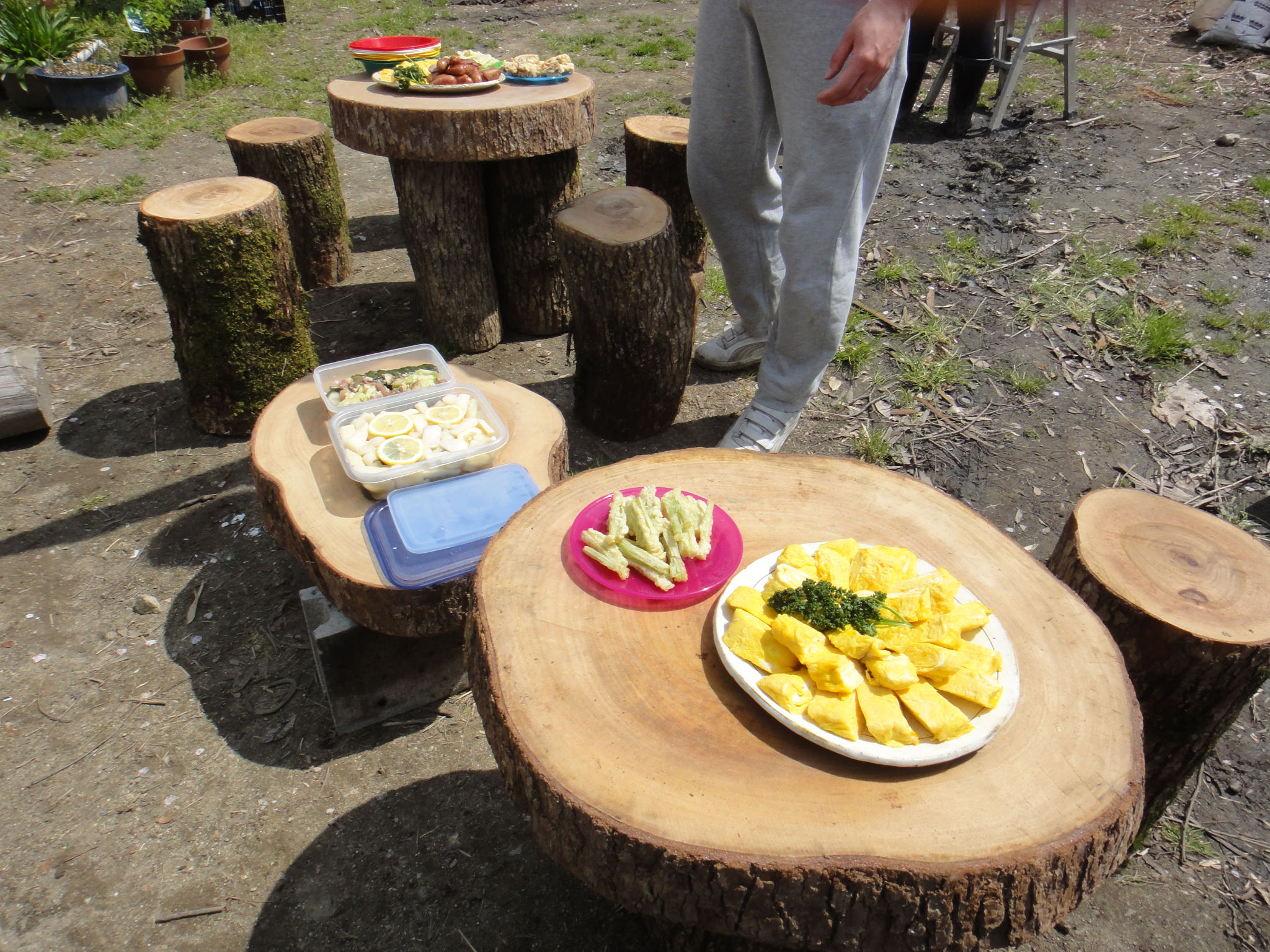 丸太で作った机と椅子がとってもかわいいと思いませんか?収納可能です。